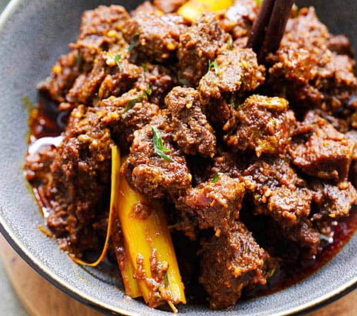 Beef rendang is traditionally served together with ketupat which is rice dumpling wrapped in coconut leaf and ghee rice during weddings or annual festivities. Today, itโs a popular accompaniment to any sort of rice dish. Beef rendang comprises beef cubes in a slow-cooked curry thatโs heavily spiced with ginger, turmeric, kaffir lime, chilies, toasted coconut, and asam keping, which comes from a rainforest tree thatโs native to Peninsular Malaysia.